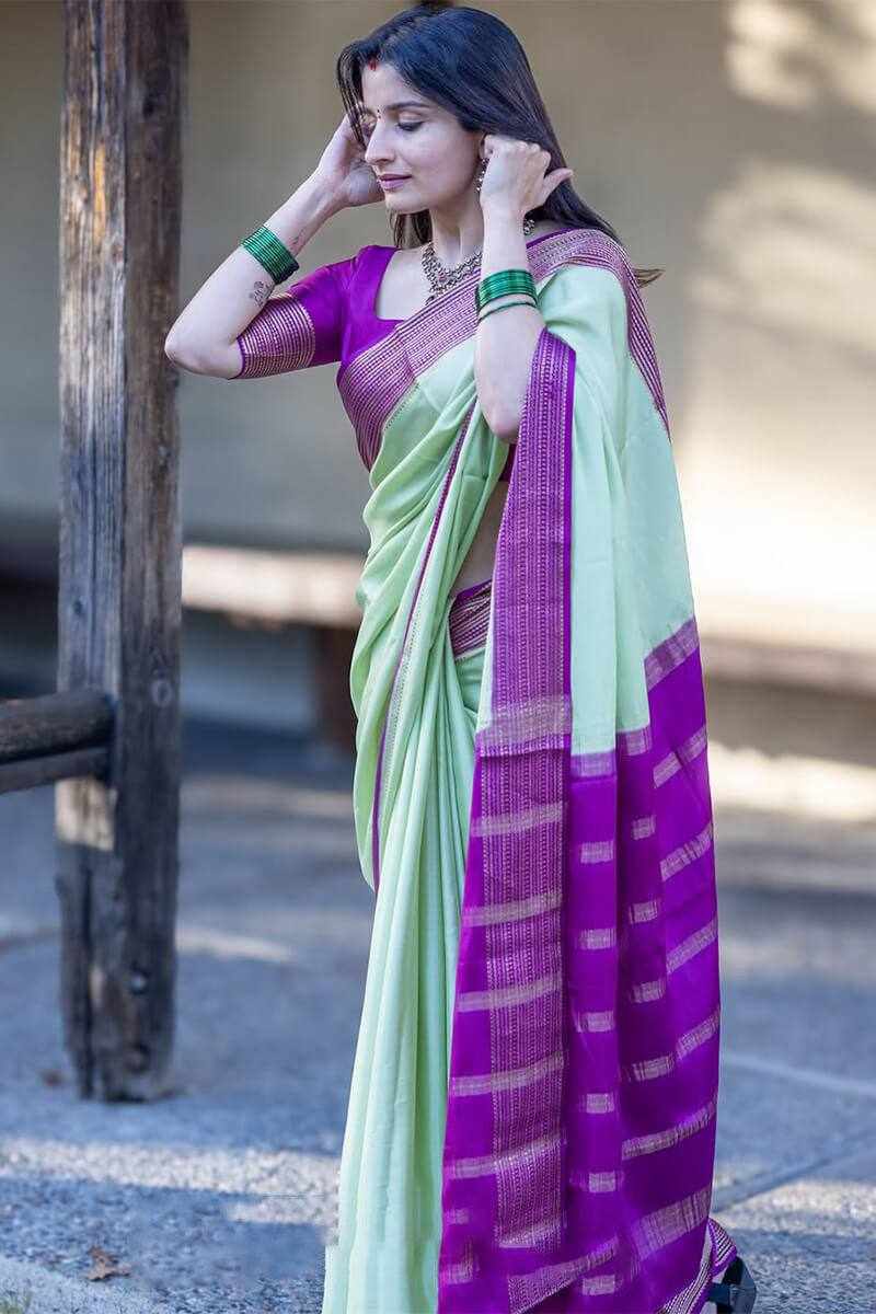 Design: Elegant rich pallu with exquisite jacquard weaving beautifully crafted all over the saree